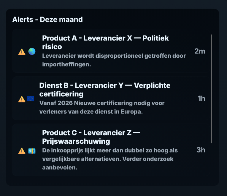 Houd risico’s, compliance en duurzaamheidsinformatie continu in de gaten. Onze AI levert realtime waarschuwingen en overzichtelijke inzichten.